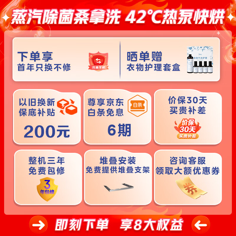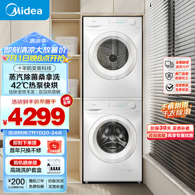 美的(Midea)洗烘套装 10公斤滚筒洗衣机全自动+热泵烘干机 蒸汽除菌 除螨除潮 毛屑过滤MG100V11F+11F价格:4299.00元!