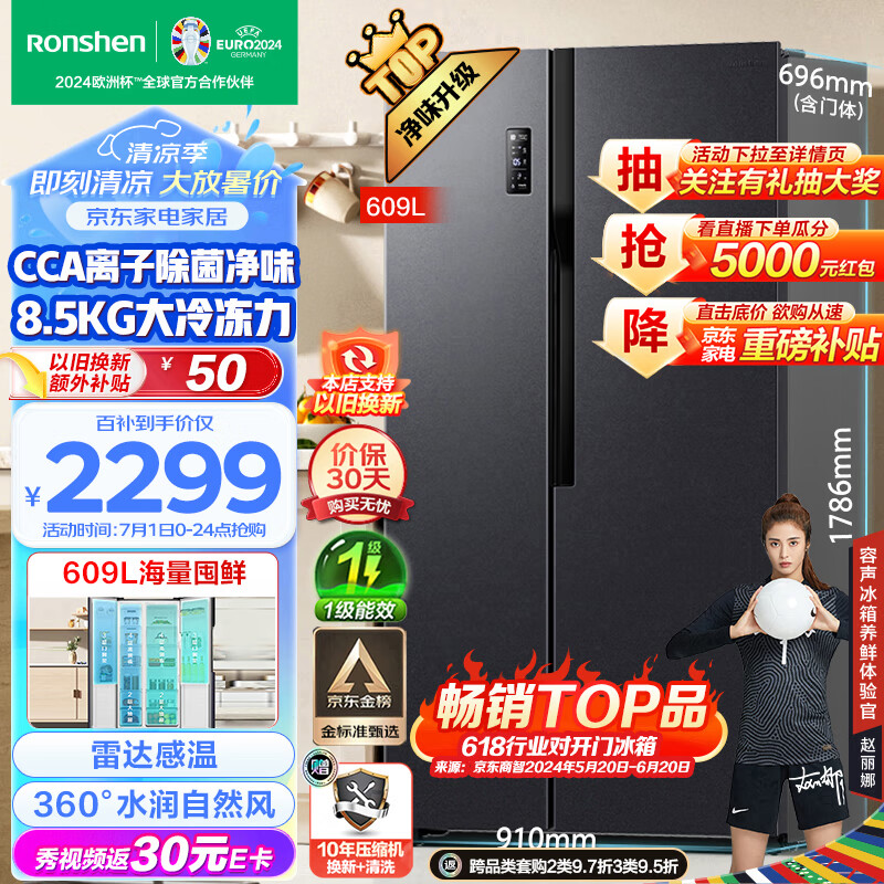 容声(Ronshen)离子净味609升变频一级能效对开门双开门冰箱家用无霜离子除菌BCD-609WD11HP大容量嵌入式价格:2599.00元!