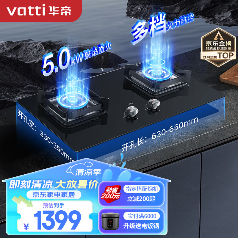 华帝(VATTI)燃气灶家用嵌入式 5.0kW大火力高热效易打理猛火灶台嵌两用 双灶台灶具JZT-i10072B(天然气)价格:1399.00元!