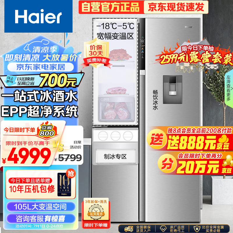 海尔585升侧T型双门三开门电冰箱家用一级能效变频节能无霜除菌全温区嵌入式可制冰BCD-585WGHFTH7S7U1价格:4999.00元!
