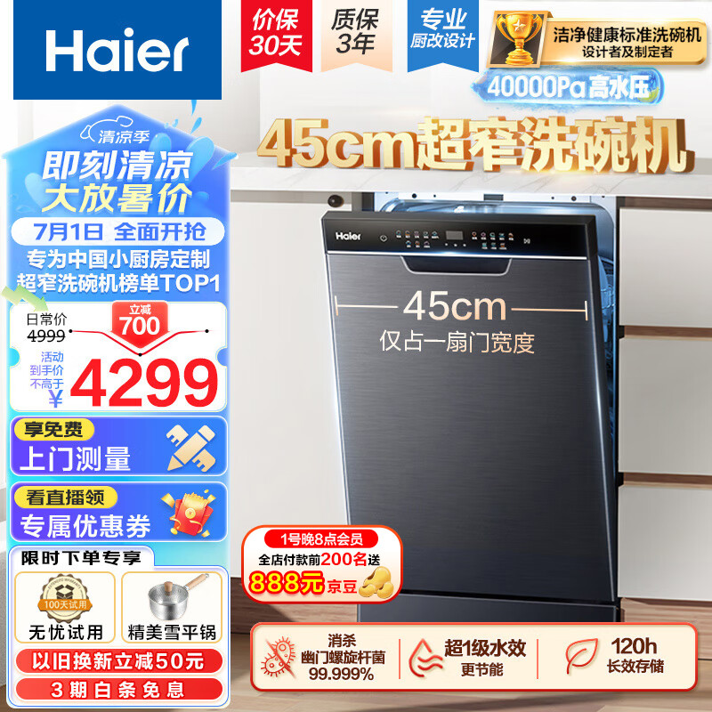 海尔(Haier)12套嵌入式洗碗机X3000 45cm超窄 80℃消杀 变频一级水效 分区洗 EYBW122286BKU1价格:4299.00元!