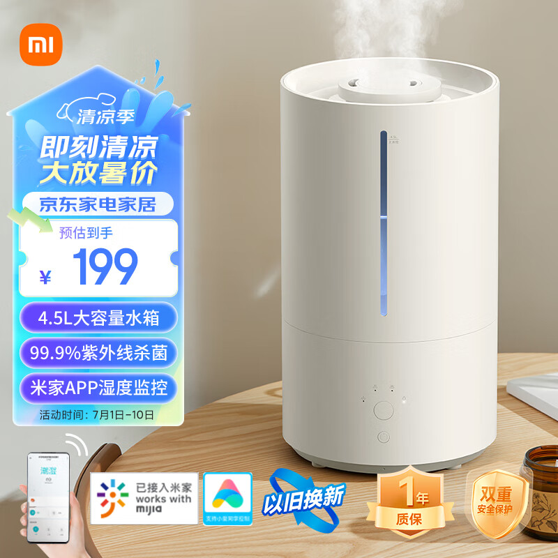 米家小米智能除菌加湿器2 卧室轻音杀菌大雾量 孕妇婴儿 智能恒湿上加水 4.5L大容量 空调伴侣价格:199.00元!
