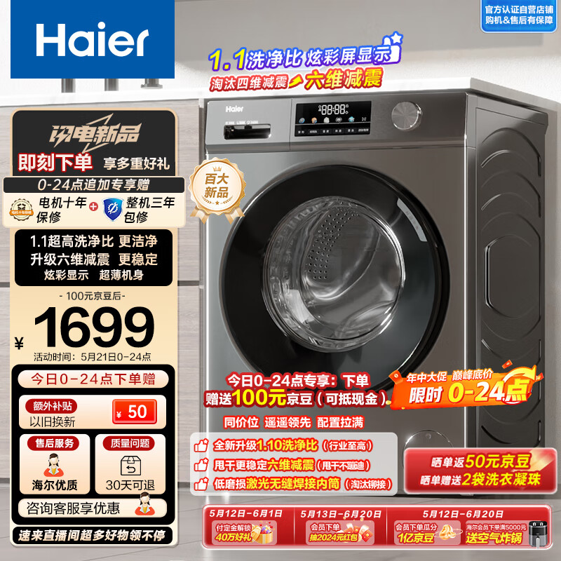 海尔(Haier)滚筒洗衣机全自动 初色系列 10公斤大容量 1.1超高洗净比 EG100MATE29S 以旧换新 超薄家用价格:1799.00元!