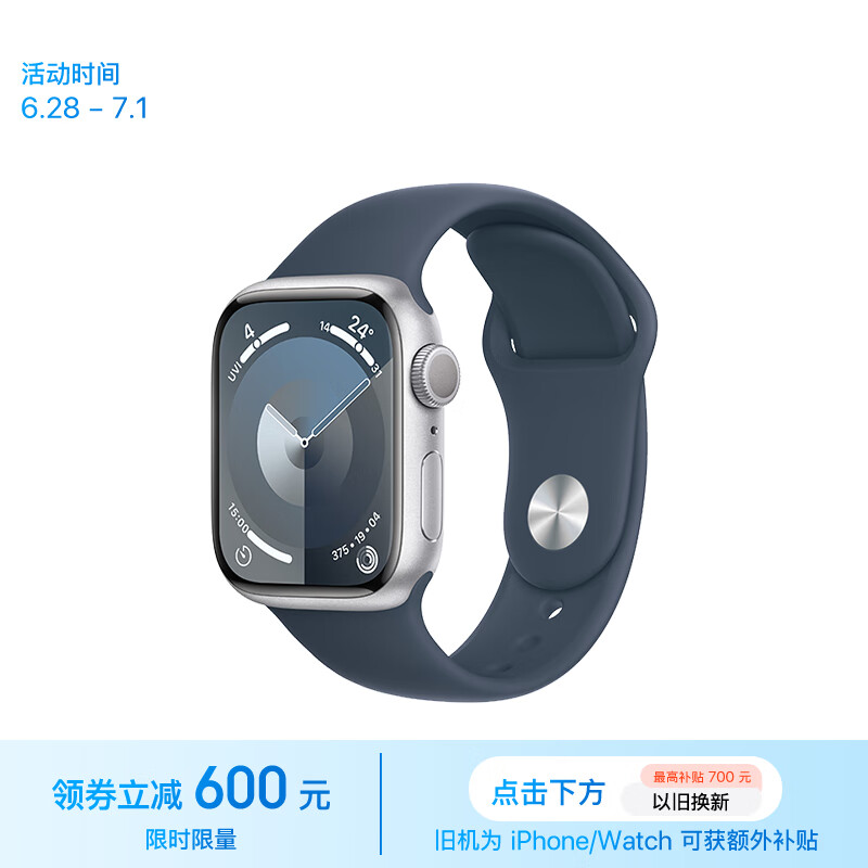 Apple/苹果 Watch Series 9 智能手表GPS款41毫米银色铝金属表壳 风暴蓝色运动型表带S/M MR903CH/A价格:2999.00元!