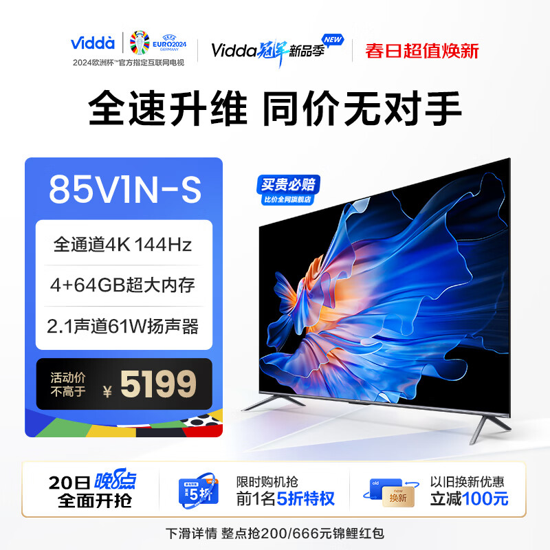 Vidda 85V1N-S 海信 85英寸 游戏电视 144Hz高刷 HDMI2.1金属屏 4+64G 液晶巨幕以旧换新价格:5199.00元!