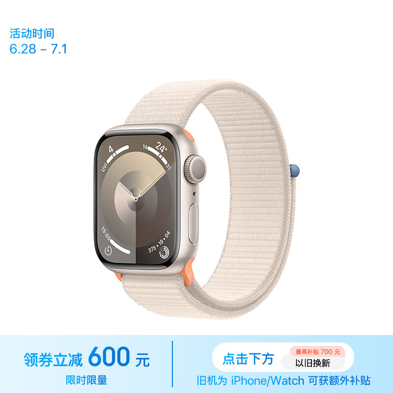 Apple/苹果 Watch Series 9 智能手表GPS款41毫米星光色铝金属表壳 星光色回环式运动表带 MR8V3CH/A价格:2999.00元!