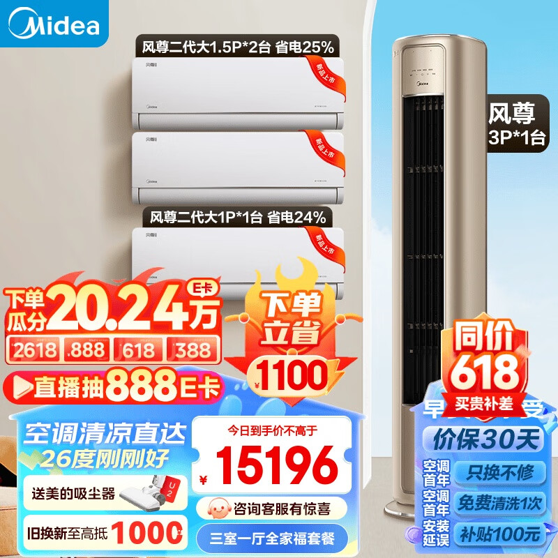 美的(Midea)空调 风尊系列 全家福套餐 三室一厅套装(大1.5匹风尊二代*2+大1匹风尊二代+3匹风尊柜机)价格:16296.00元!
