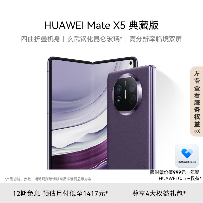 华为(HUAWEI) Mate X5 典藏版 折叠屏手机 16GB+1TB 幻影紫价格:16999.00元!