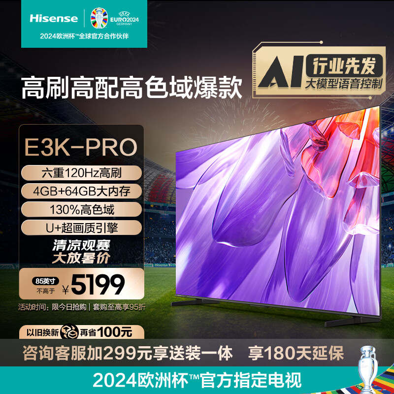 海信电视85E3K-PRO 85英寸 120Hz 130%色域 MEMC 4+64GB 远场语音 智能平板巨幕电视机价格:5199.00元!