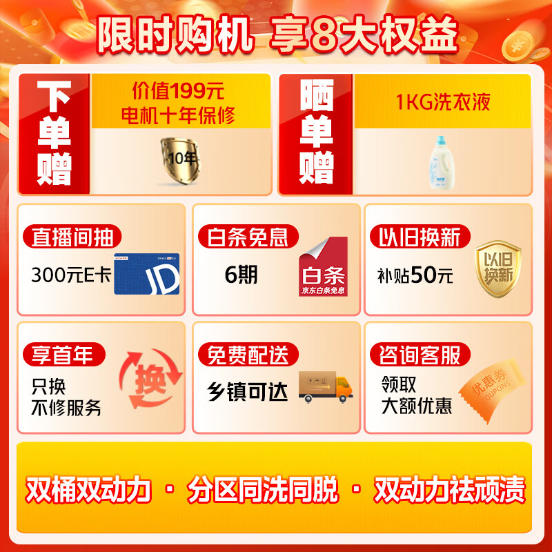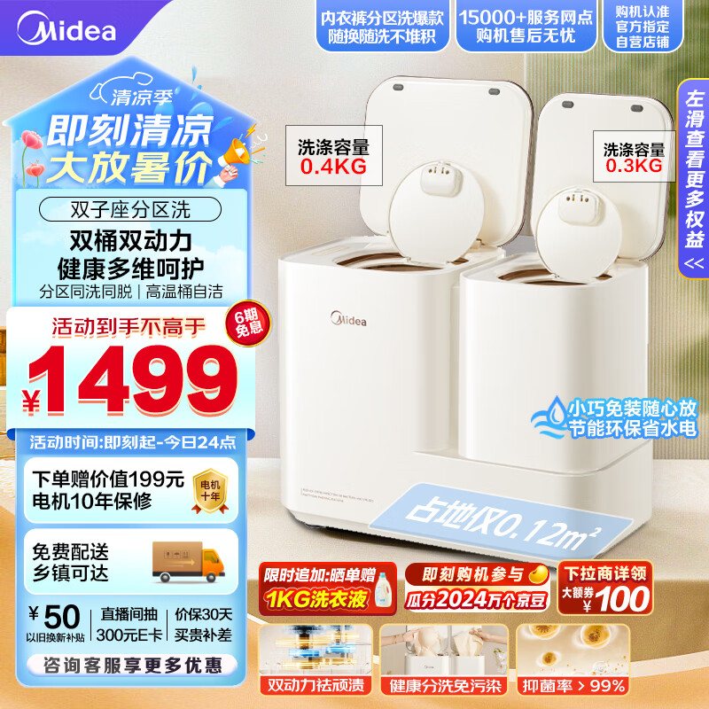 美的双子座分区洗衣机家用 内衣裤洗衣机小型 迷你洗衣机 母婴洗衣机 双动力少缠绕 同洗同脱 MNB7VA0E价格:1499.00元!