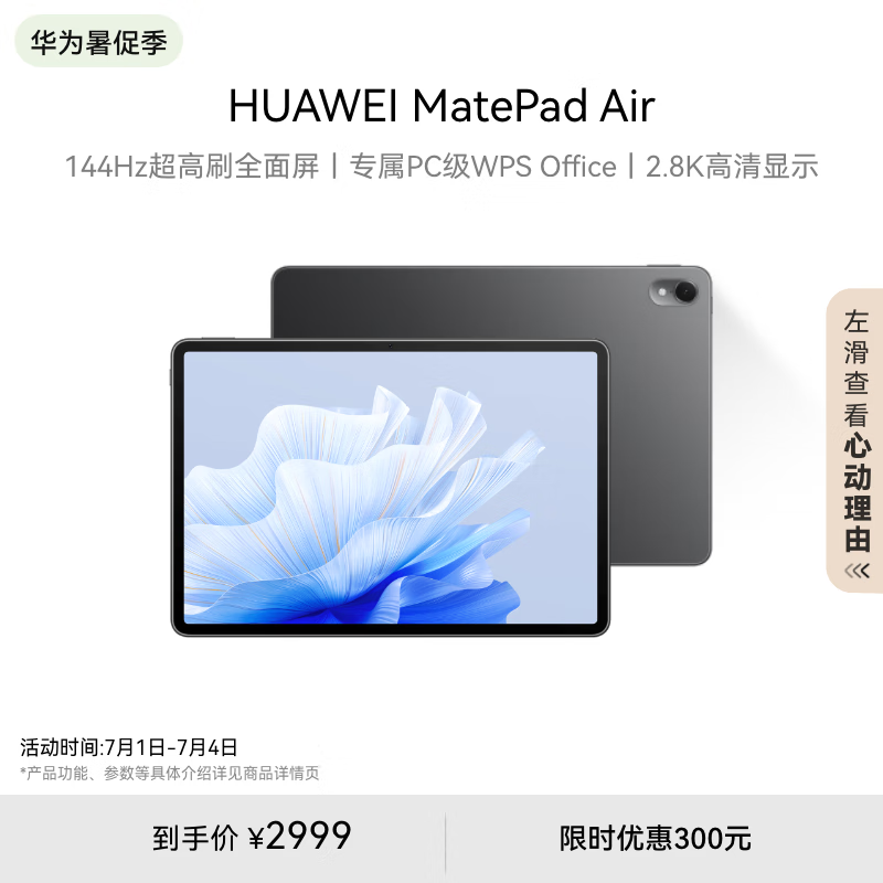 HUAWEI MatePad Air 华为平板电脑11.5英寸144Hz护眼屏2.8K超清办公学习娱乐 12+256GB 曜石黑价格:2999.00元!