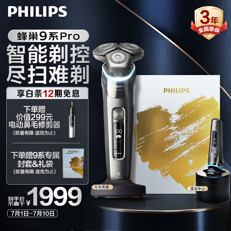 飞利浦(PHILIPS)电动剃须刀蜂巢9系Pro+ SkinIQ智能光感刮胡刀 配无线清洁中心 生日礼物 送男友 送老公价格:1999.00元!
