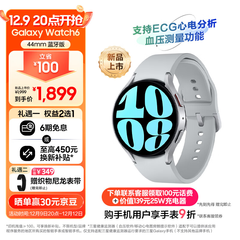 三星Galaxy Watch6 蓝牙通话/智能手表/运动电话手表/ECG心电分析/血压手表/健康监测 44mm 星系银价格:1999.00元!