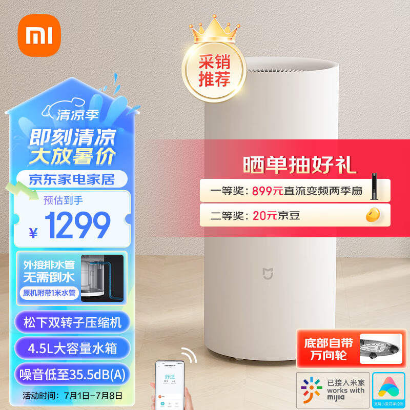 米家 小米除湿机 家用抽湿机 大除湿量 每日可达22L 五重降噪 卧室轻音 除潮空气 干衣机 智能互联价格:1299.00元!