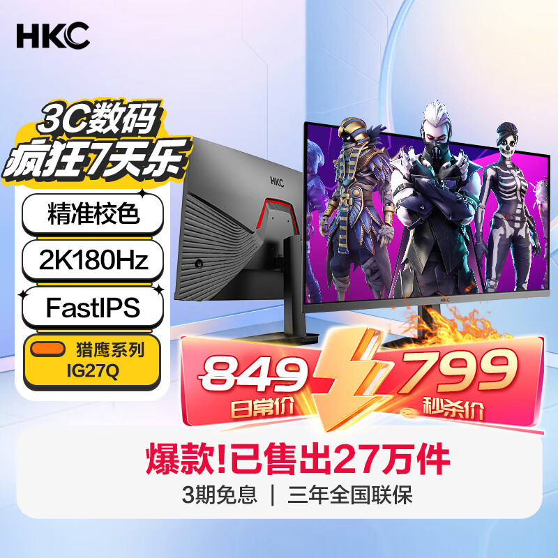 HKC 27英寸2K高清180Hz高分FastIPS快速液晶显示屏1ms游戏电竞家用外接笔记本台式电脑显示器IG27Q价格:999.00元!