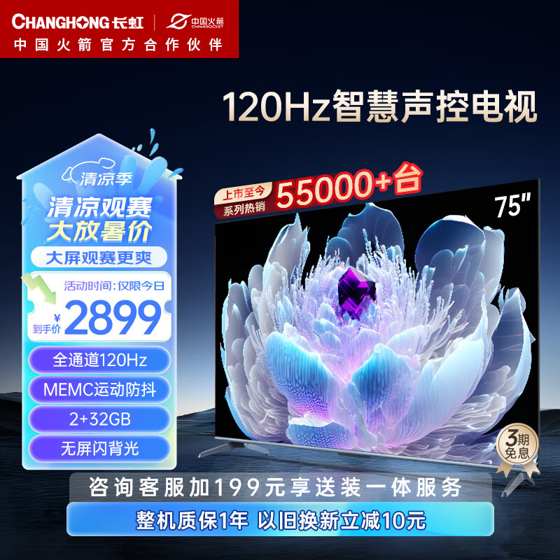 长虹电视75D6 75英寸120Hz高刷免遥控语音杜比视界 2+32GB MEMC四大投屏 4K平板液晶LED电视机以旧换新价格:2899.00元!