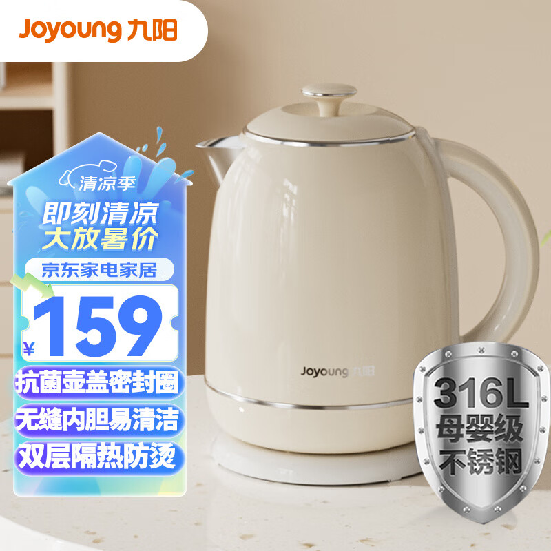 九阳(Joyoung)热水壶烧水壶电水壶1.5L 双层隔热316L不锈钢无缝内胆 轻复古家用开水壶K15FD-W582价格:159.00元!
