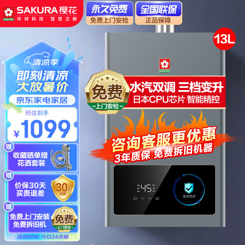 樱花(SAKURA)13升燃气热水器天然气水气双调日本CPU智能精控恒温变频低压启动三档变升多重安防JSQ25-JJP009价格:1299.00元!