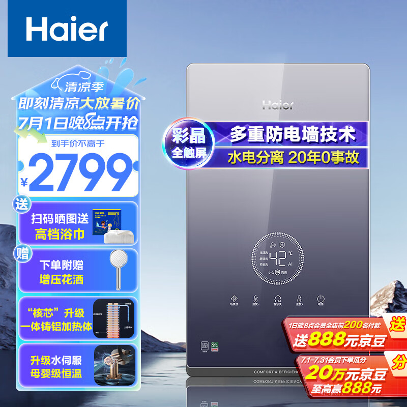 海尔(Haier)电热水器即热式即开即热大水量水电双变频AI四季恒温家用超薄速热洗澡器DSH-85AJ3【以旧换新】价格:2999.00元!