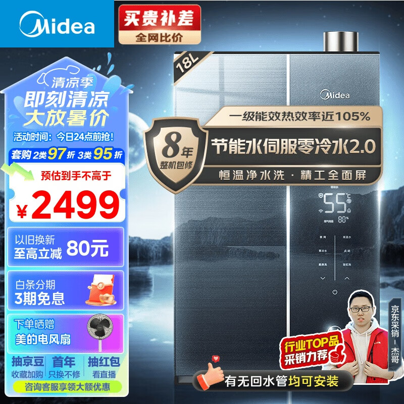 美的(Midea)18升燃气热水器 天然气 一级能效节能 水伺服恒温 增压零冷水 防冻 大水量 JSLQ30-18LN5影青价格:2499.00元!