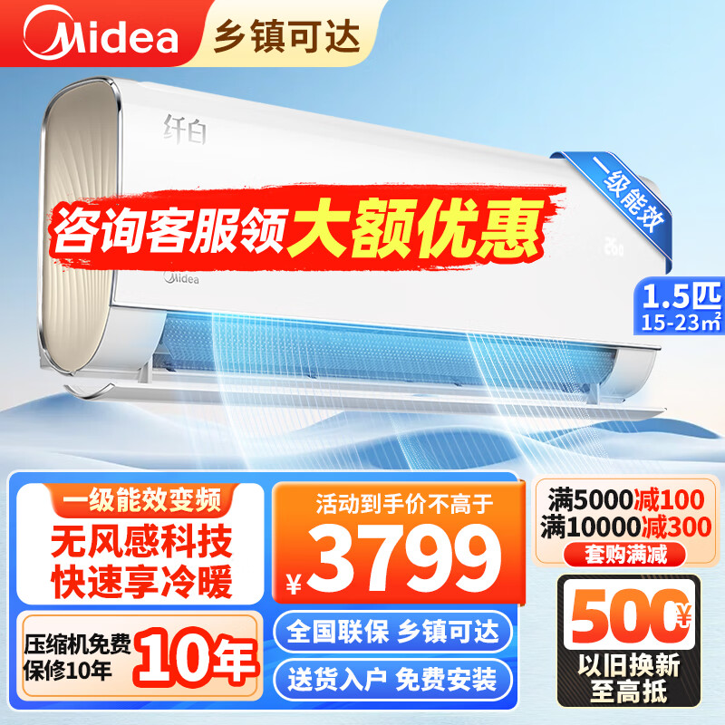 美的空调 1.5匹纤白 智能家电 变频冷暖 新一级壁挂式空调挂机 舒适无风感 KFR-35GW/N8MWD1 智选价格:3799.00元!