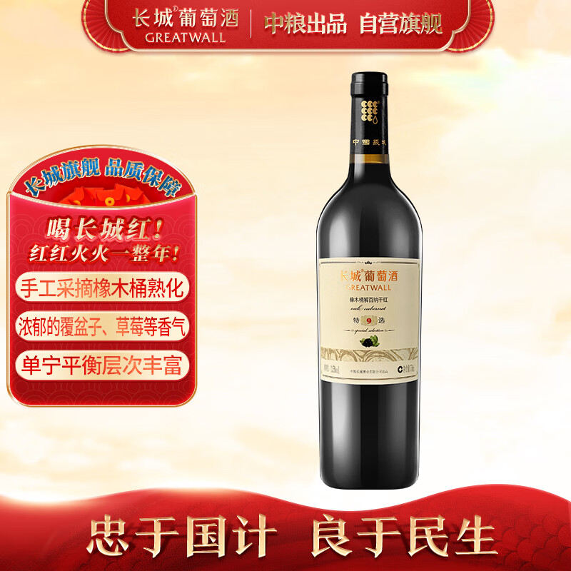 长城 特选9橡木桶解百纳干红葡萄酒 750ml 单瓶装价格:82.90元!