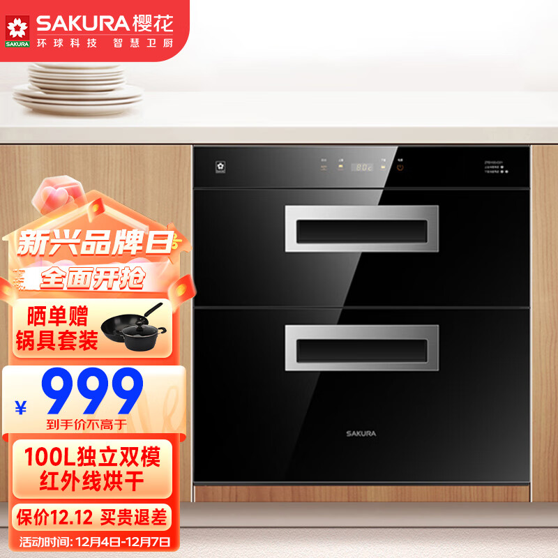 樱花(SAKURA)消毒柜家用嵌入式 臭氧+紫外线+高温 100L独立双模嵌入式碗柜 消毒红外线烘干 ZTD100-C01价格:1199.00元!