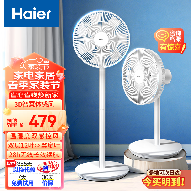 海尔(Haier)电风扇直流省电落地扇家用智能语音APP操控电扇大风量台立两用无线续航风扇 HFS-Y3031BCU1价格:479.00元!