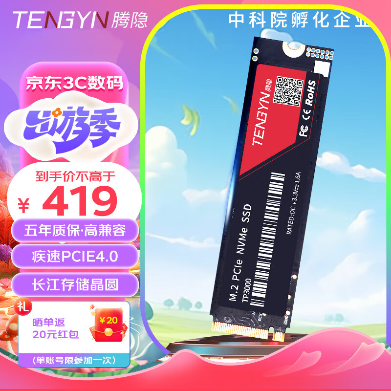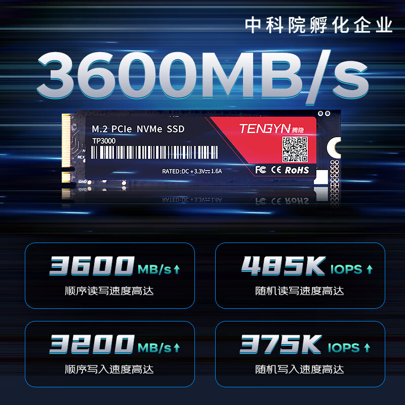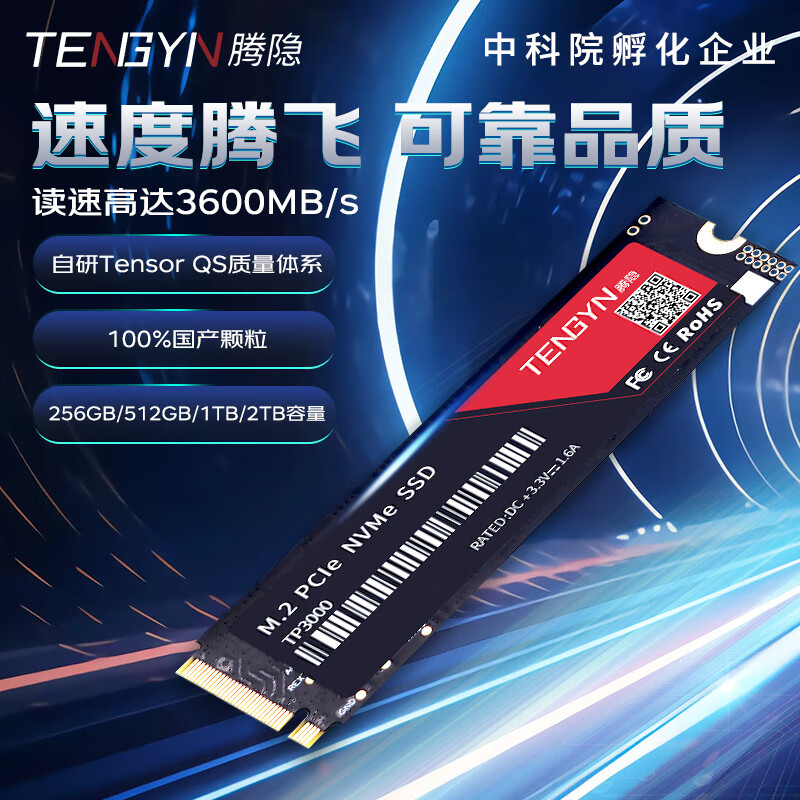 腾隐(TENGYIN)精选长江存储晶圆 台式机笔记本SSD固态硬盘PCIe3.0 M.2接口 1TB TP3000 读速3600MB/S价格:639.00元!