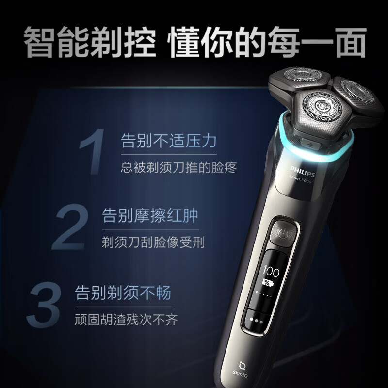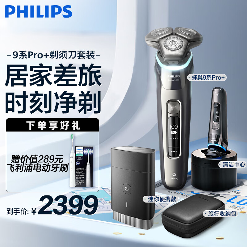 飞利浦(PHILIPS)差旅居家两用电动剃须刀套装 蜂巢9系Pro+SkinIQ智能感应&黑锋刃PQ888迷你便携价格:2399.00元!