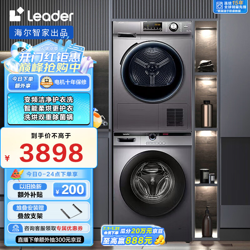 Leader海尔出品洗烘套装 10Kg洗衣机全自动+10Kg热泵烘干机家用 以旧换新 @G10B22SE+@TG10076S价格:3898.00元!