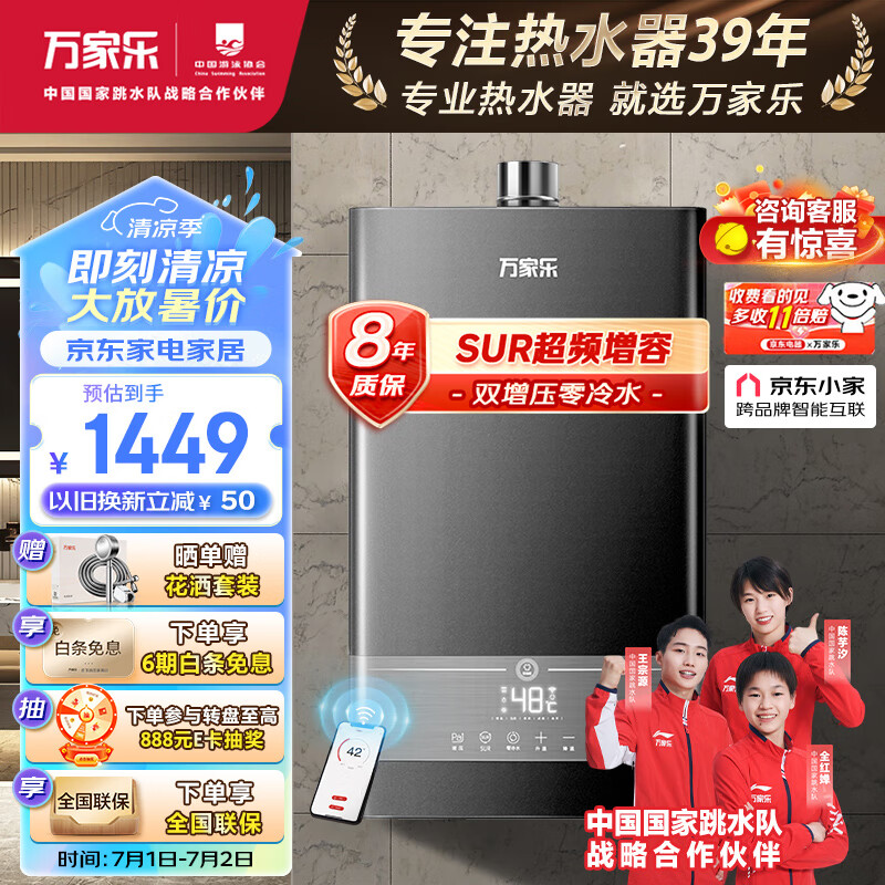 万家乐 13升燃气热水器京东小家智能佛山标准产品双增压增容零冷水恒温天然气JSQ26-13DL1【以旧换新】价格:1449.00元!
