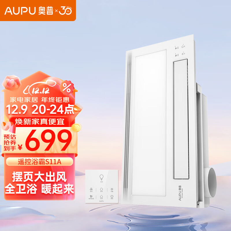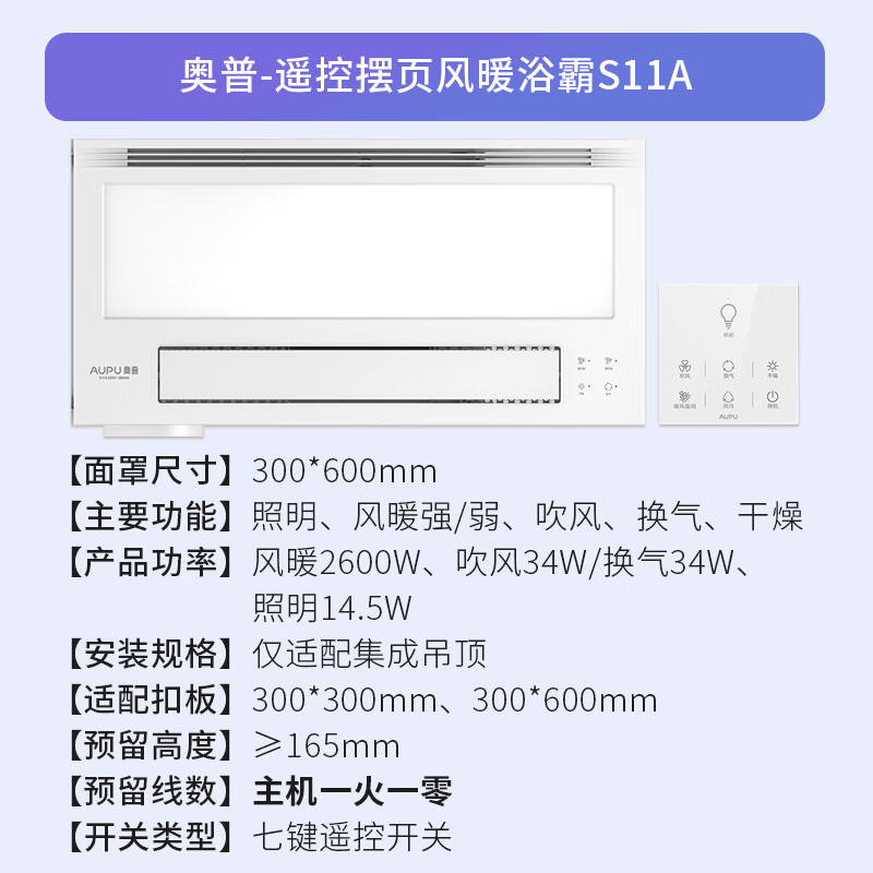 奥普(AUPU)浴霸S11A风暖浴霸 宽摆页出风 强弱风暖 无线遥控 适配集成吊顶价格:999.00元!