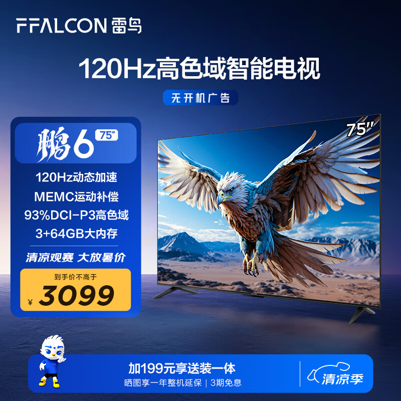 FFALCON雷鸟 鹏6 24款 电视机75英寸 120Hz动态加速 高色域 3+64GB 智能游戏液晶平板电视以旧换新75S375C价格:3099.00元!