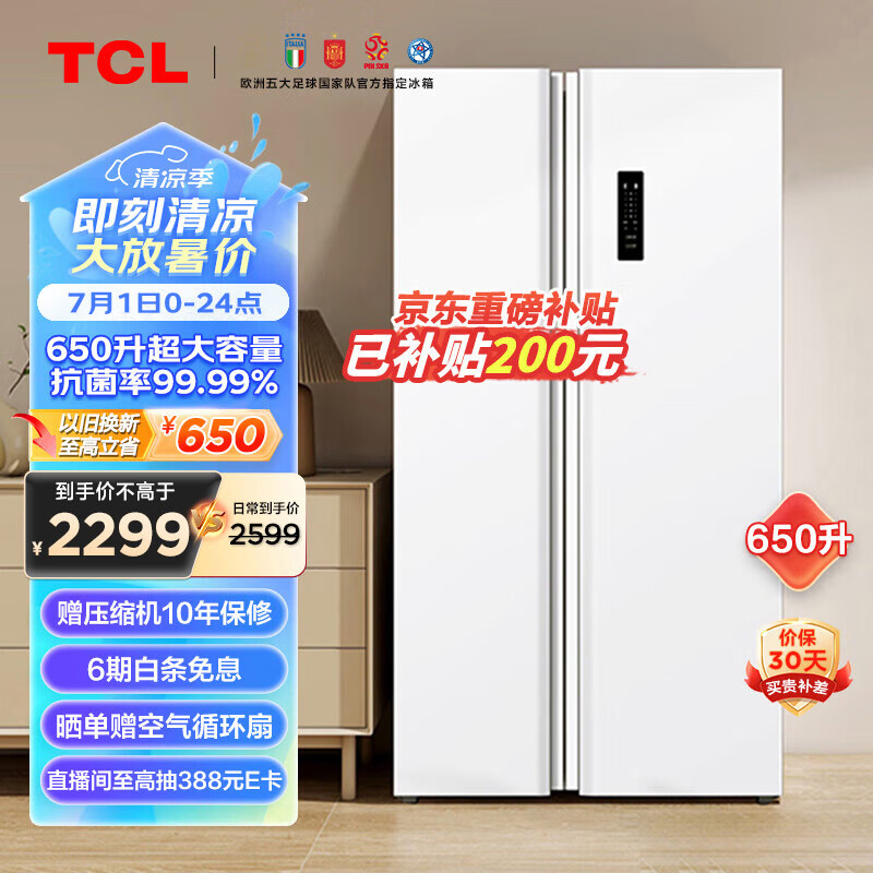 TCL650升T5超大容量对开双开门多门白色冰箱一级能效 风冷无霜 一体双变频 家用电冰箱R650T5-S芭蕾白价格:2299.00元!