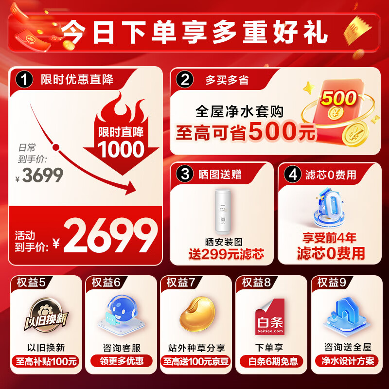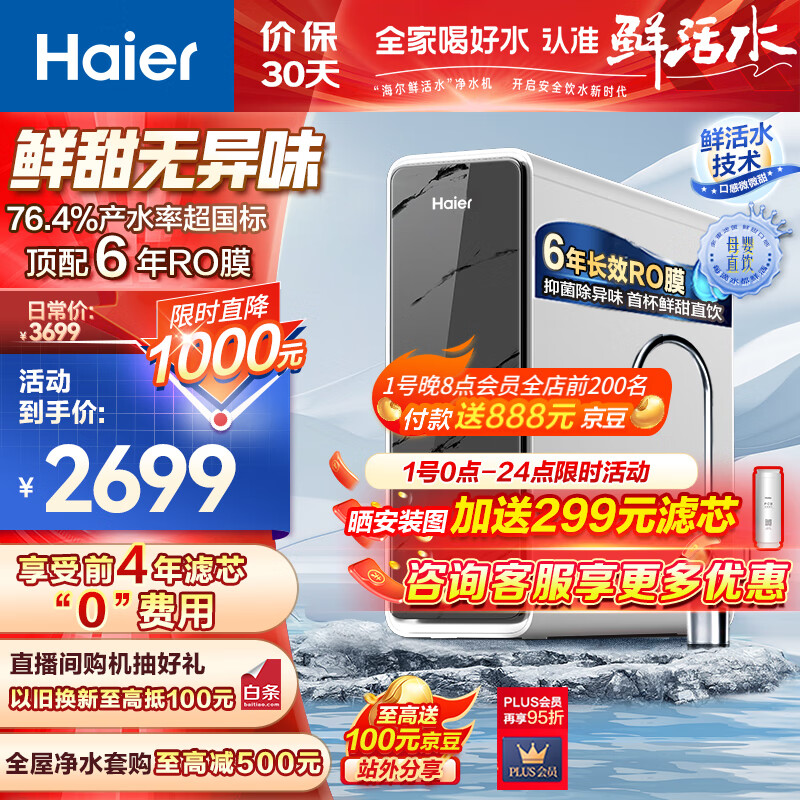 海尔(Haier)净水器1200G鲜活水 pro家用净水机6年RO反渗透大通量过滤器厨下直饮3.48L/分钟HKC3000-R793D2U1价格:2699.00元!