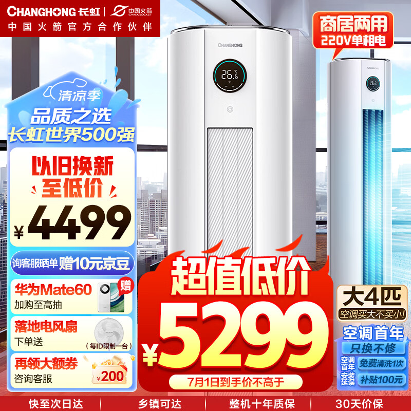 长虹(CHANGHONG)大4匹新能效节能省电商用220V单相电冷暖立式家用柜机空调KFR-100LW/ZDTTW3+R2以旧换新价格:5299.00元!