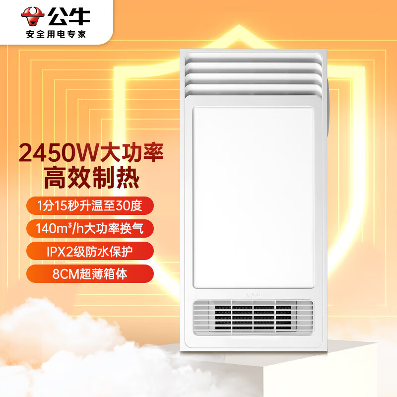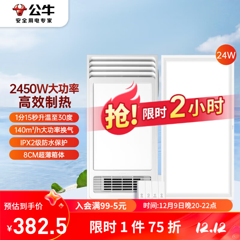 公牛(BULL)浴霸风暖浴室卫生间LED灯集成吊顶GY25AJZ浴霸+24W白色平板灯价格:510.00元!