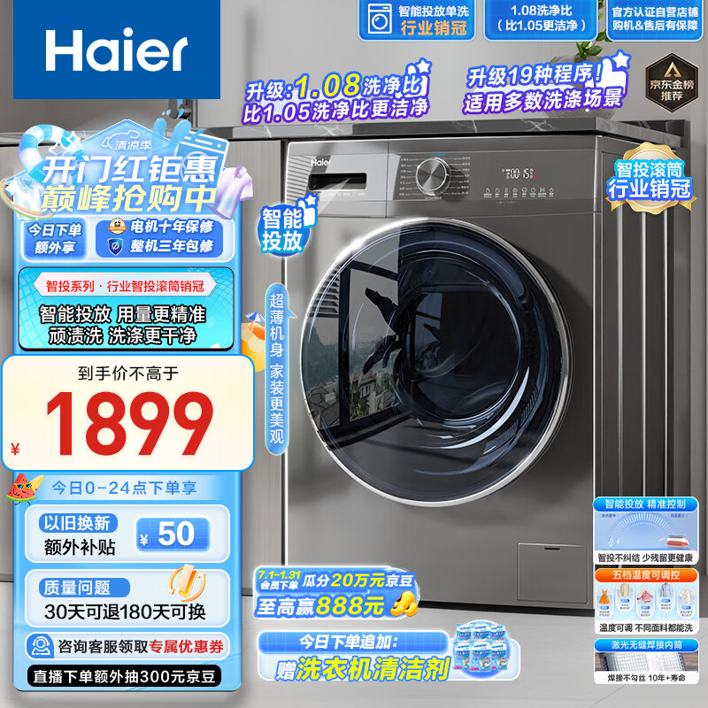 海尔(Haier)滚筒洗衣机全自动单洗 超薄家用 10公斤大容量【金榜推荐EG100MATE55】一级能效 以旧换新价格:1899.00元!