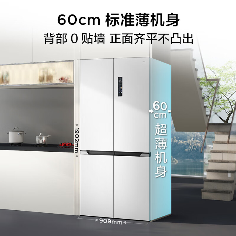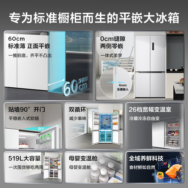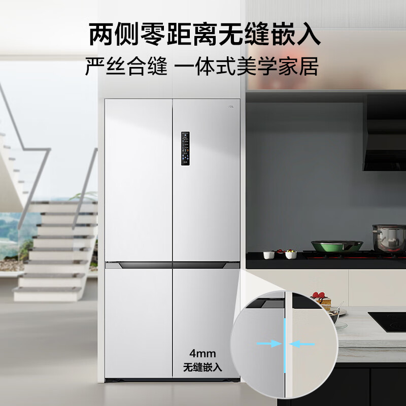 TCL 519升60厘米超薄平嵌十字对开四门大容量嵌入式家用电冰箱宽幅变温一级能效风冷无霜R519T9-UQ价格:3899.00元!