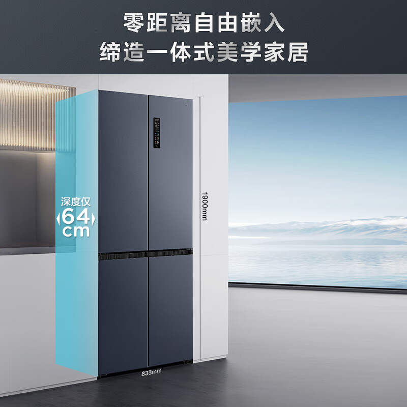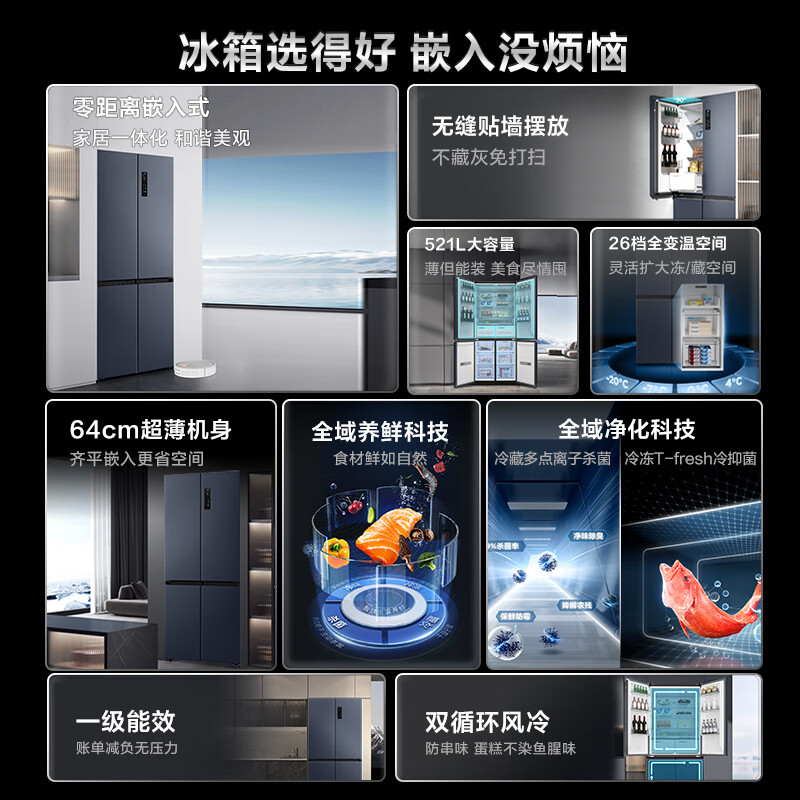 TCL 超薄零嵌系列521L十字四开门冰箱超薄嵌入式大容量家用冰箱一级变频底部散热双循环R521T9-UQ价格:3599.00元!