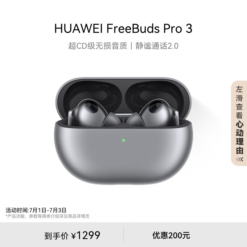 华为(HUAWEI)FreeBuds Pro 3 真无线蓝牙降噪耳机 入耳式动态降噪/游戏影音/离线查找/适用Mate 60 冰霜银价格:1299.00元!