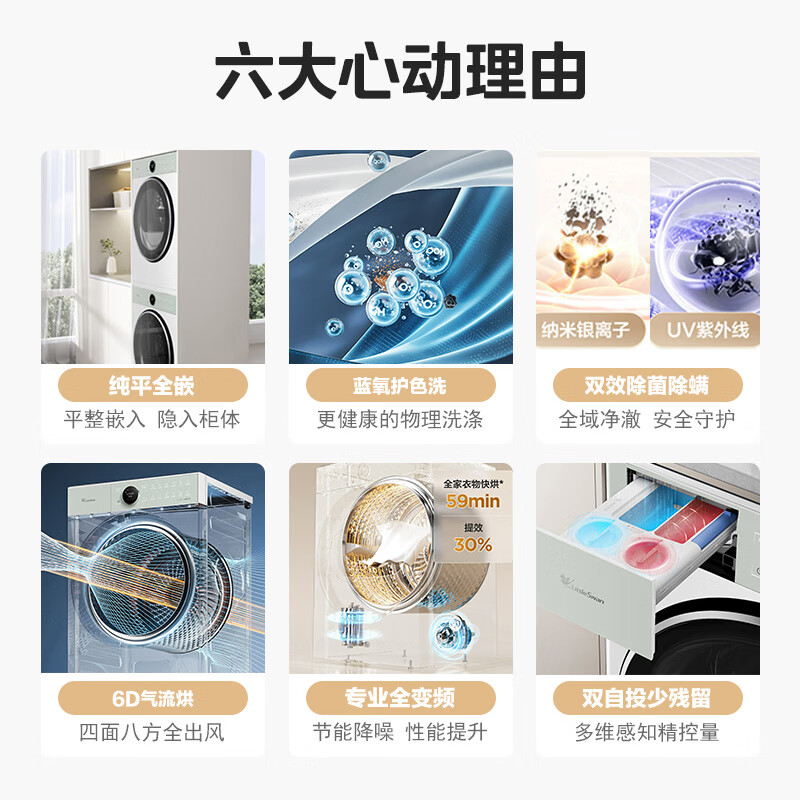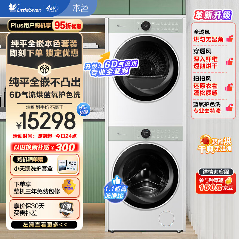 小天鹅(LittleSwan)洗烘套装 10KG滚筒洗衣机全自动+热泵烘干机家用 纯平全嵌 本色蓝氧 雨晨青TG100MS97IL-G+97W-G价格:15298.00元!