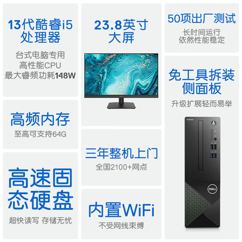 戴尔(Dell)成就3020 台式电脑主机(酷睿13代i5-13400 16G 512GSSD)23.8英寸大屏显示器 高性能CPU价格:3899.00元!