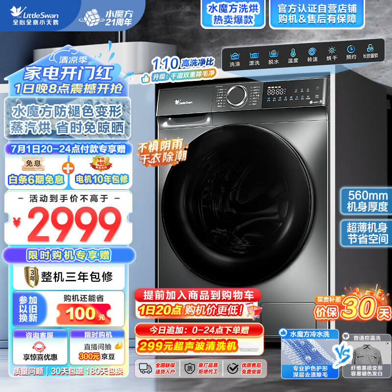 小天鹅(LittleSwan)滚筒洗衣机全自动家用 带烘干洗烘一体 水魔方【TD100V618T】10公斤 1.1洗净比 一级能效 以旧换新价格:3099.00元!