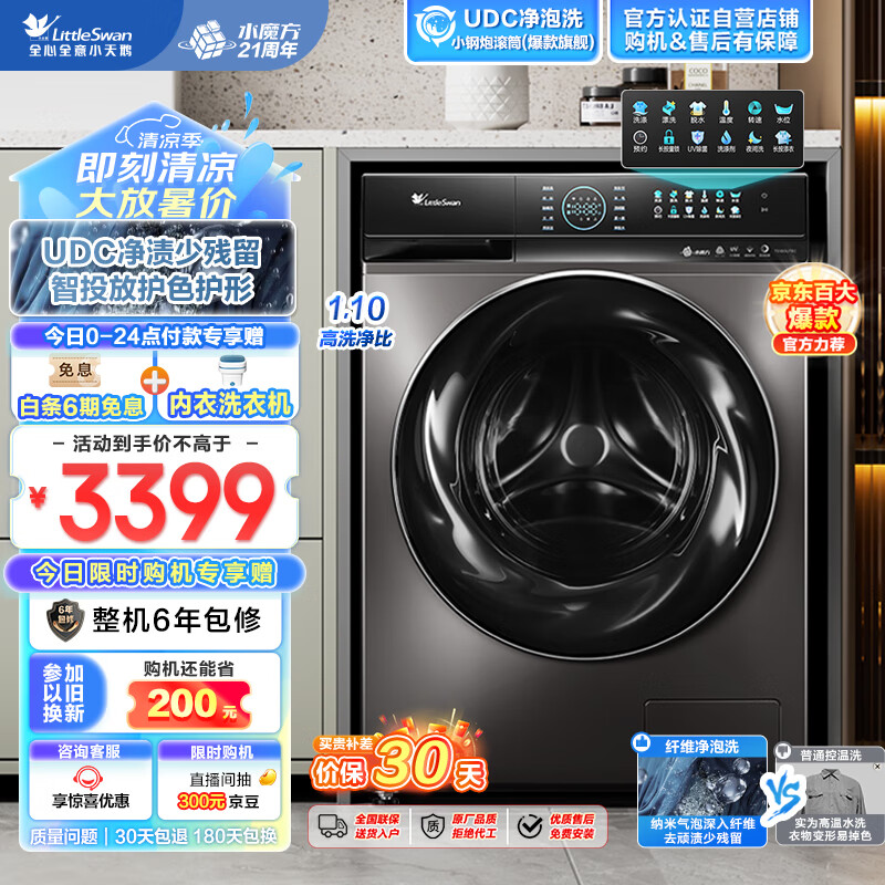 小天鹅(LittleSwan)滚筒洗衣机全自动家用 水魔方【小钢炮 TG100UTEC】UDC净渍 超薄 10公斤大容量 809单洗 以旧换新价格:3399.00元!