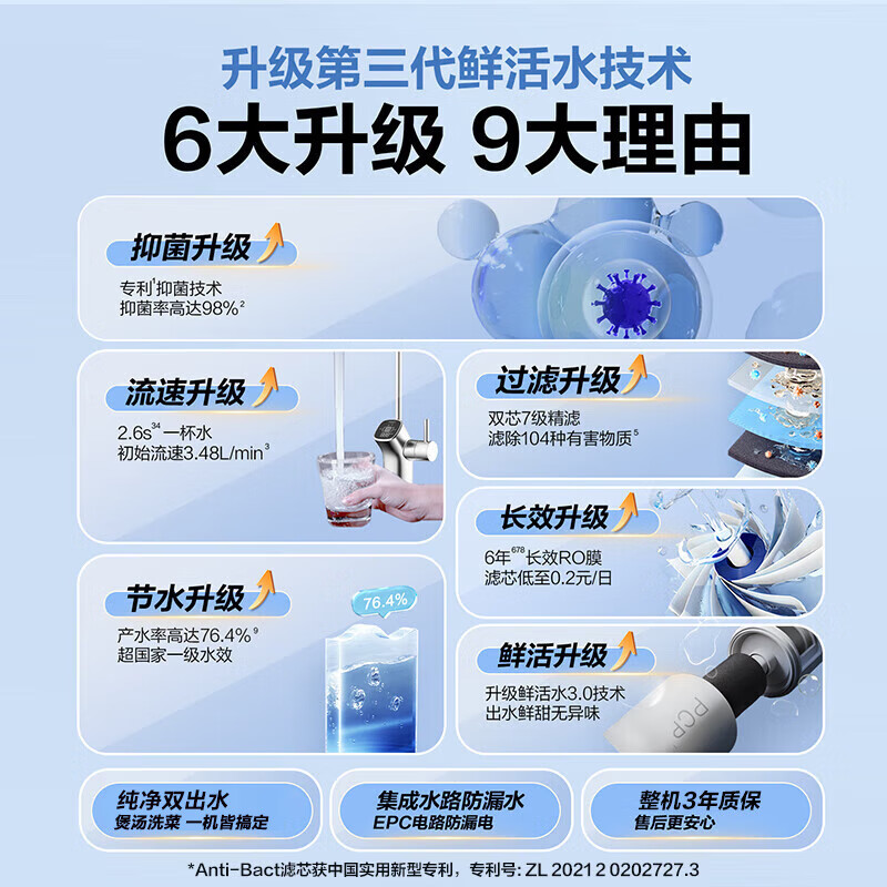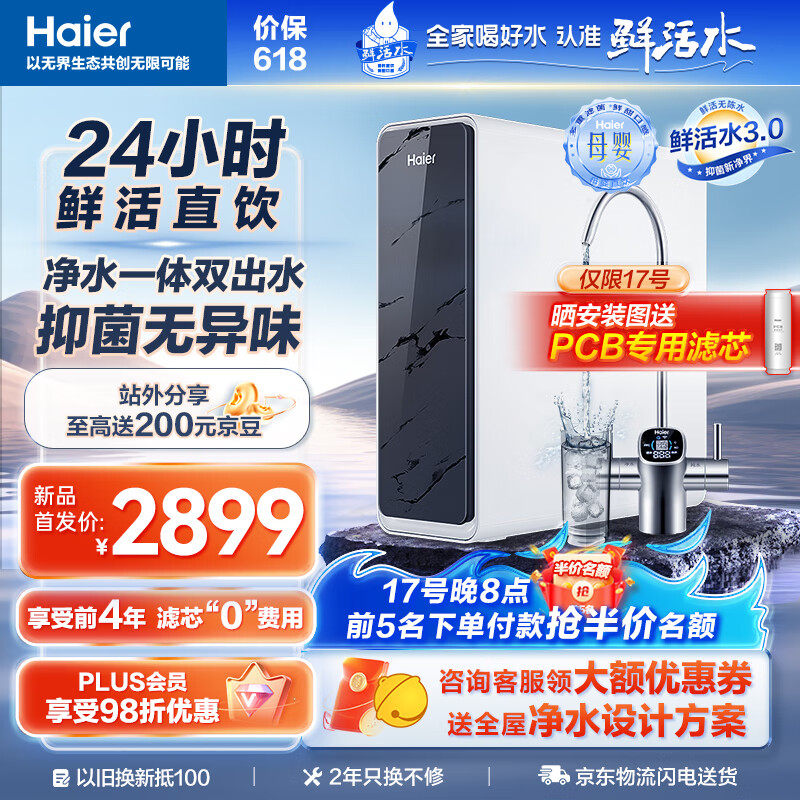 海尔(Haier)净水器1200G鲜活水双出水 pro家用净水机反渗透大通量过滤器厨下直饮HKC3000-R880D2U1价格:2899.00元!