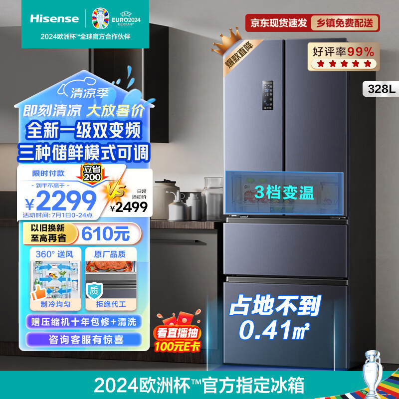 海信(Hisense)四开门冰箱法式328升无霜冰箱一级能效双变频超薄家用电冰箱BCD-328WNK1DPT除菌净味小占地价格:2499.00元!