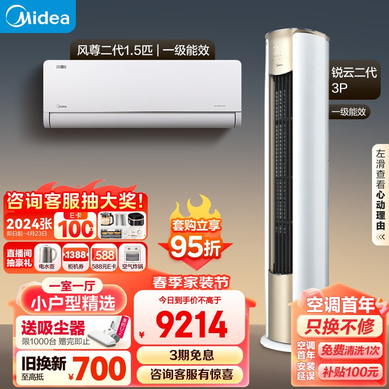 美的(Midea)空调 风尊系列 小户型精选 一室一厅套装(1.5匹风尊二代一级+3匹锐云二代柜机一级)一站购齐套购价格:9698.00元!