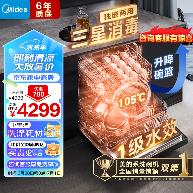 美的(Midea)14套嵌入式洗碗机 RX600Pro 升级105℃热风烘干+升降碗篮 一级水效 三星消毒 分层洗 独立式两用价格:4299.00元!